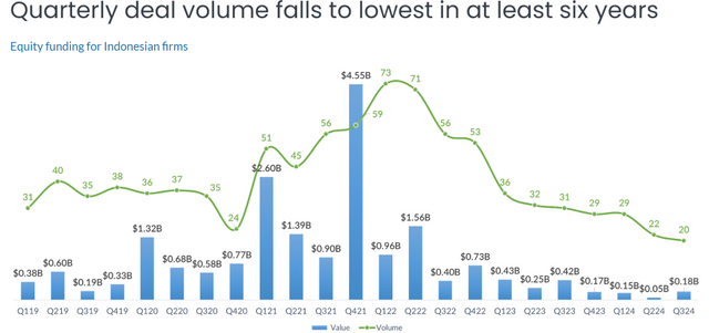 The development also comes as startup funding in Indonesia plummeted to a six-year low in the third quarter of 2024, according to DealStreetAsia DATA VANTAGE‘s SE Asia Deal Review: Q3 2024 report.